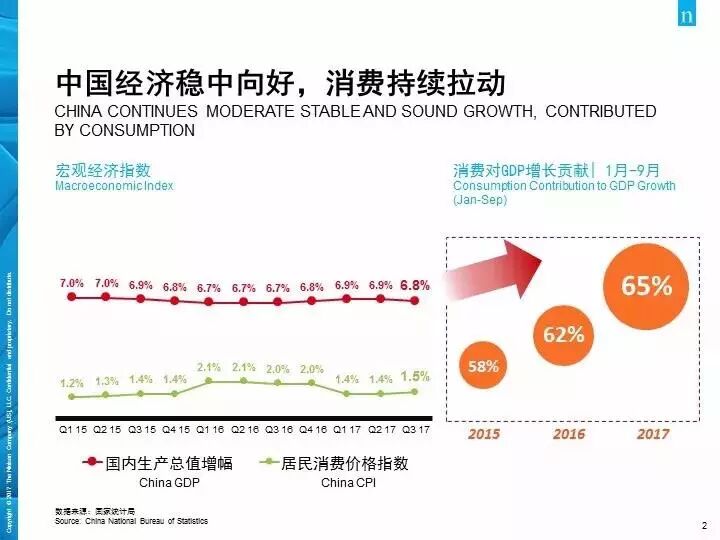 In 2017, the Chinese economy remained stable and improved, with consumption continuously driving economic growth. In the first nine months of 2017, consumption contributed 65% to GDP, which has been increasing year by year.
