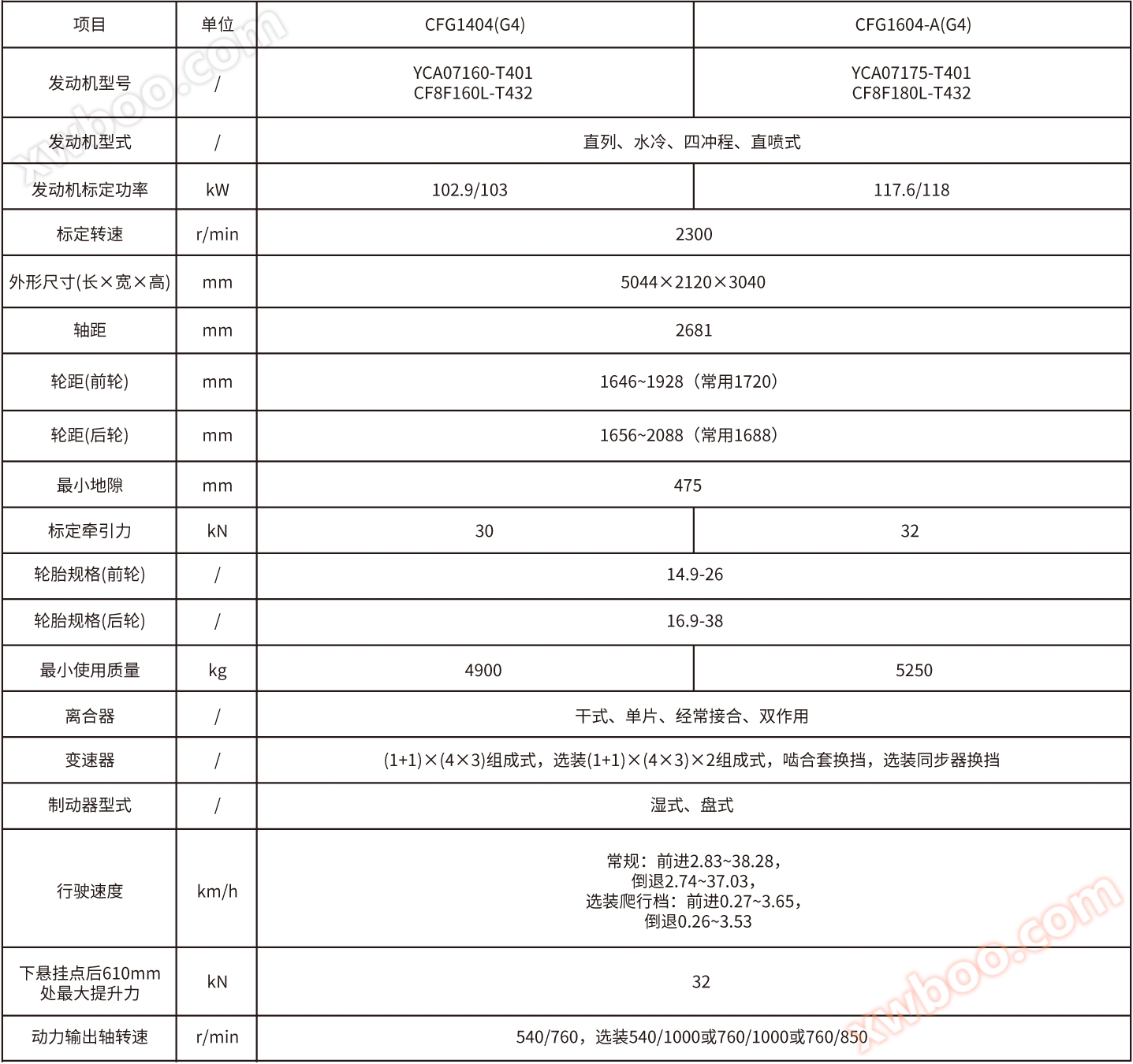 Basic configuration: Changfa/Yuchai engine, gearbox (24+24 with crawl gear, synchronizer shift), hydraulic steering, split PTO shaft with 8- φ 48-760/1000, front wheel 14.9-26, rear wheel 16.9-38, high pressure lifter, adjustable towing device, two sets of hydraulic outputs, 14 560 kg front counterweights, double-layer 400 kg rear counterweights, air-conditioned cab, satellite positioning, multi working condition