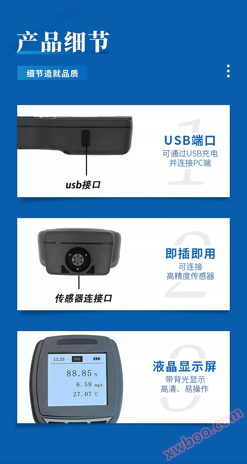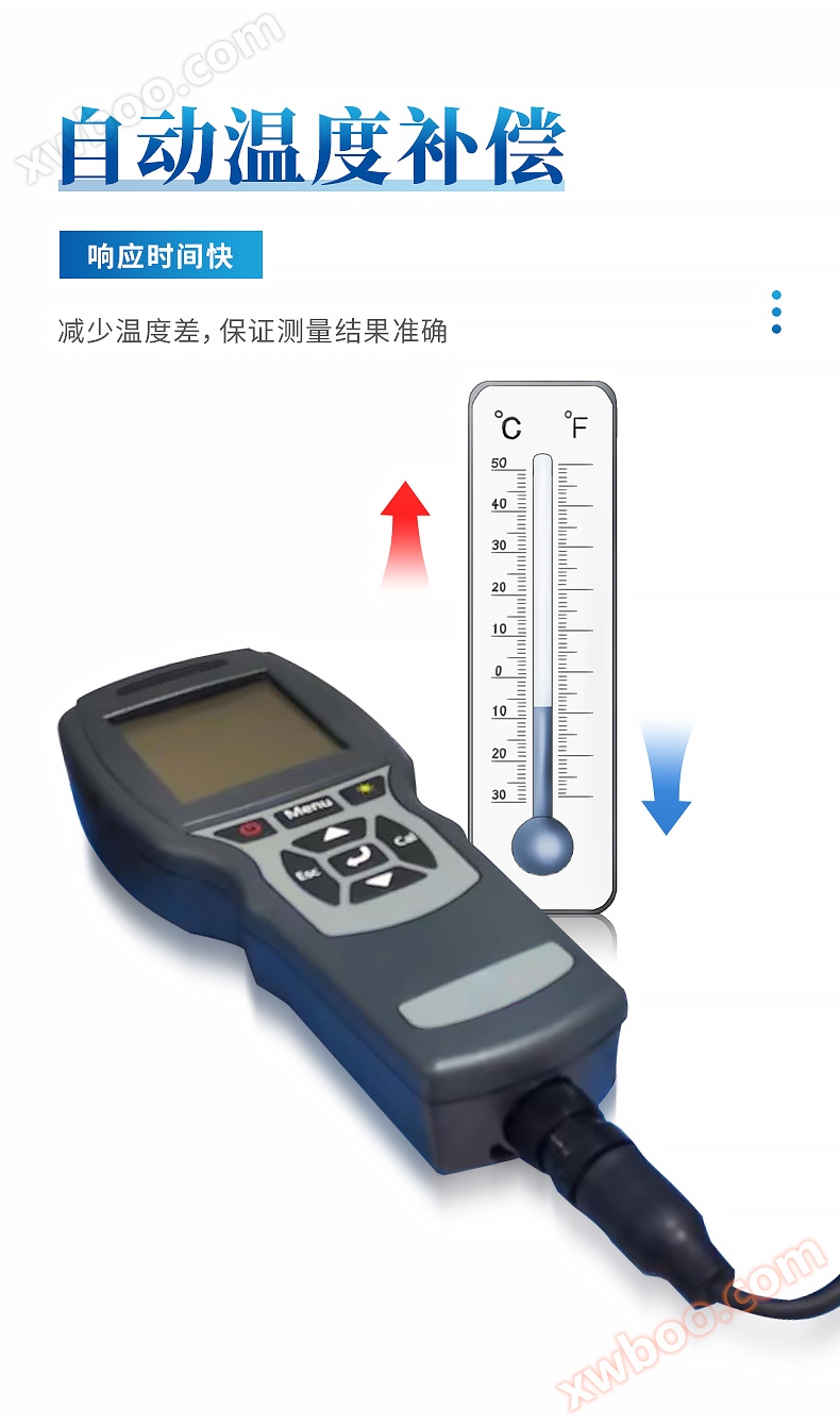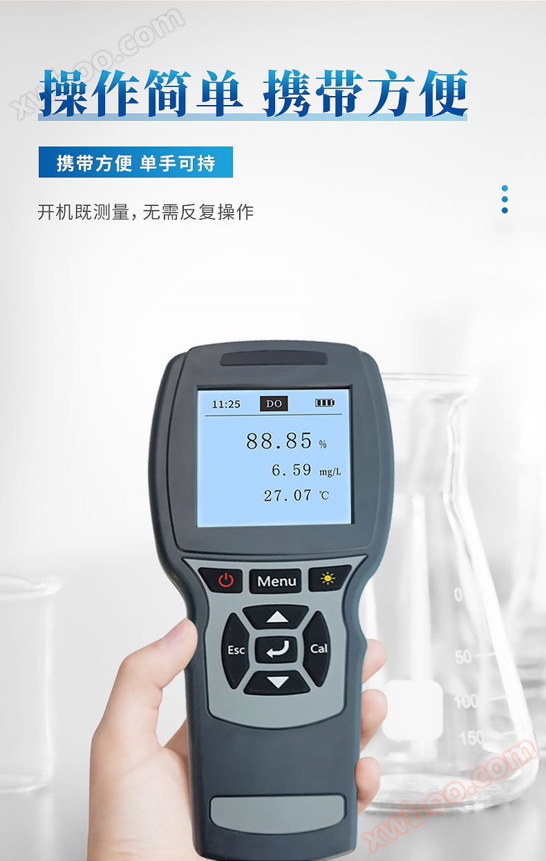 The dissolved oxygen tester (hereinafter referred to as the instrument) is mainly designed for the convenience of users to carry and operate on site. This instrument can be divided into two parts: sensors and electronic units. The sensor adopts a polarographic coated dissolved oxygen electrode. The electronic unit is composed of highly integrated circuits. The instrument adopts a dot matrix liquid crystal display, which can display the dissolved oxygen value and temperature.
