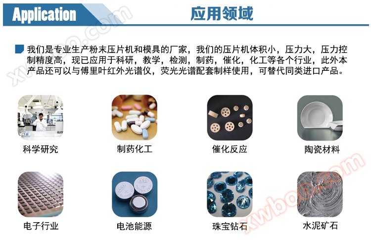 We are a professional manufacturer of powder tablet presses and molds. Our tablet presses have small volume, high pressure, and high pressure control accuracy. They have been applied in various industries such as scientific research, teaching, testing, pharmaceuticals, catalysis, and chemical engineering. In addition, this product can also be used in conjunction with Fourier transform infrared spectrometers and fluorescence spectrometers for sample preparation, and can replace similar imported products.