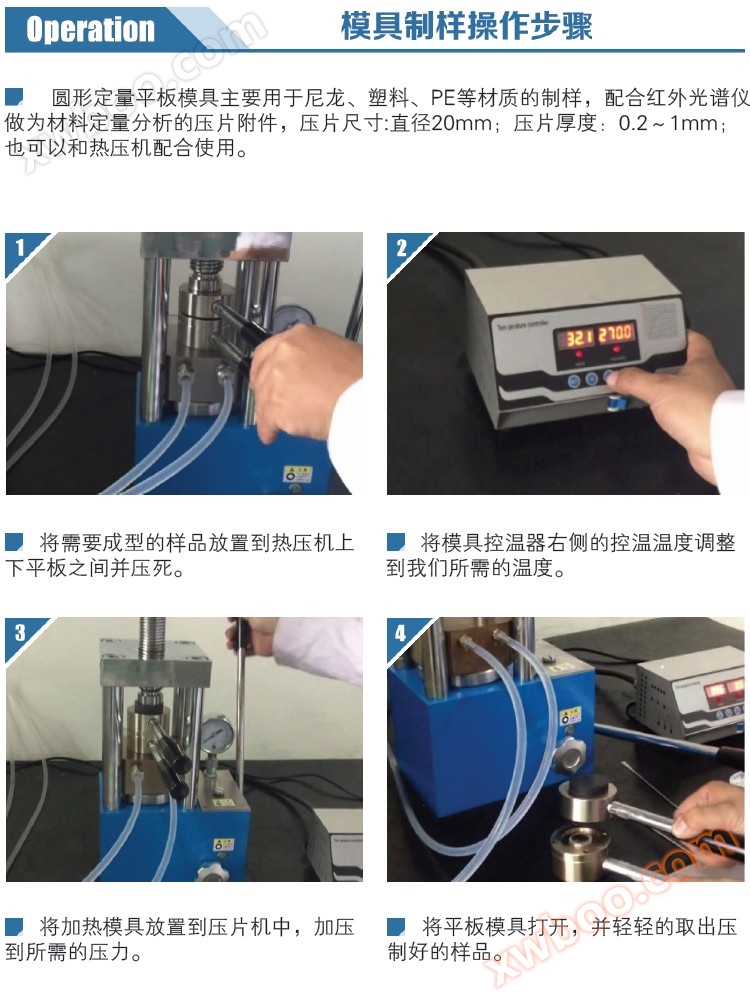 The circular quantitative flat mold is mainly used for sample preparation of materials such as nylon, plastic, PE, etc. It is used as a tablet accessory for material quantitative analysis in conjunction with an infrared spectrometer. The tablet size is 20mm in diameter and the tablet thickness is 0.2-1mm. It can also be used in conjunction with a hot press machine.