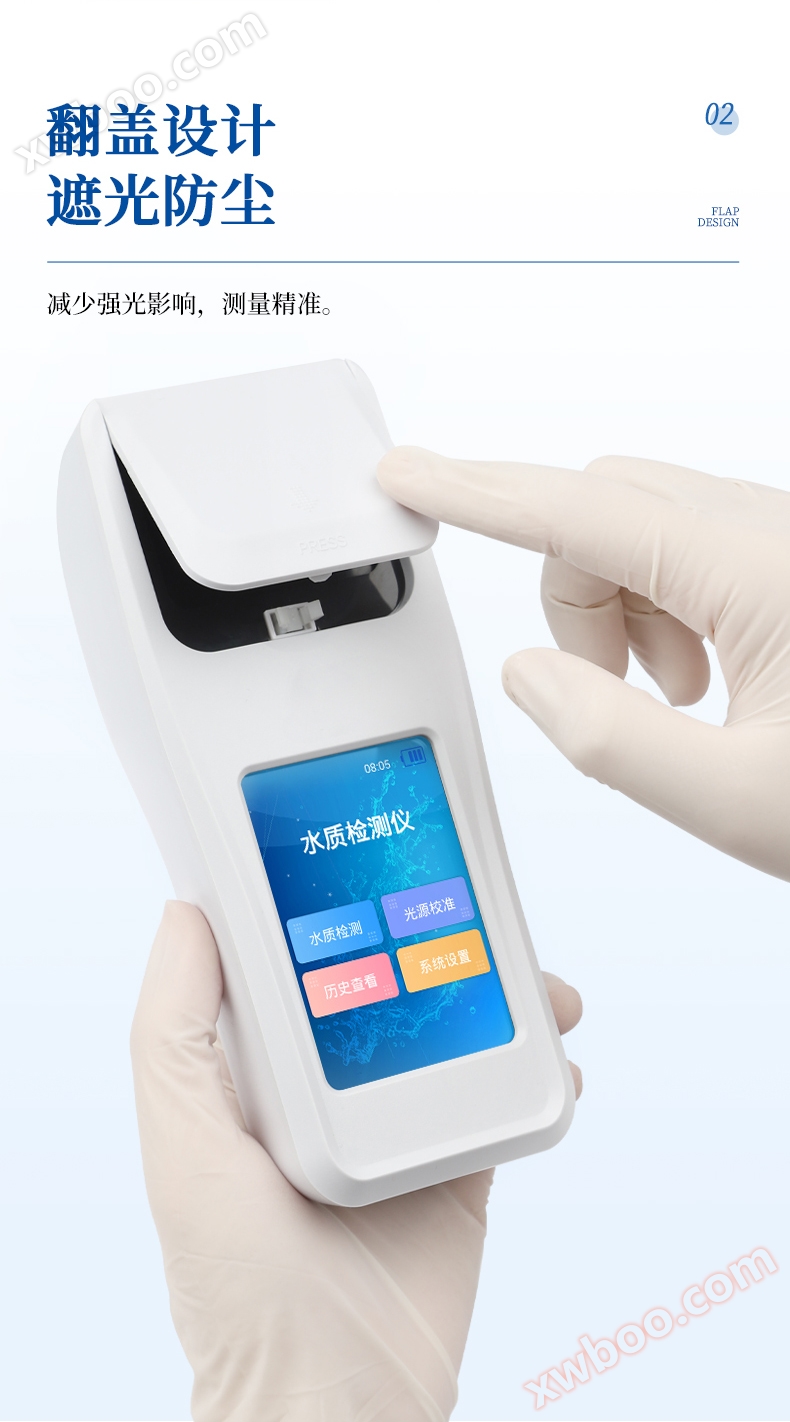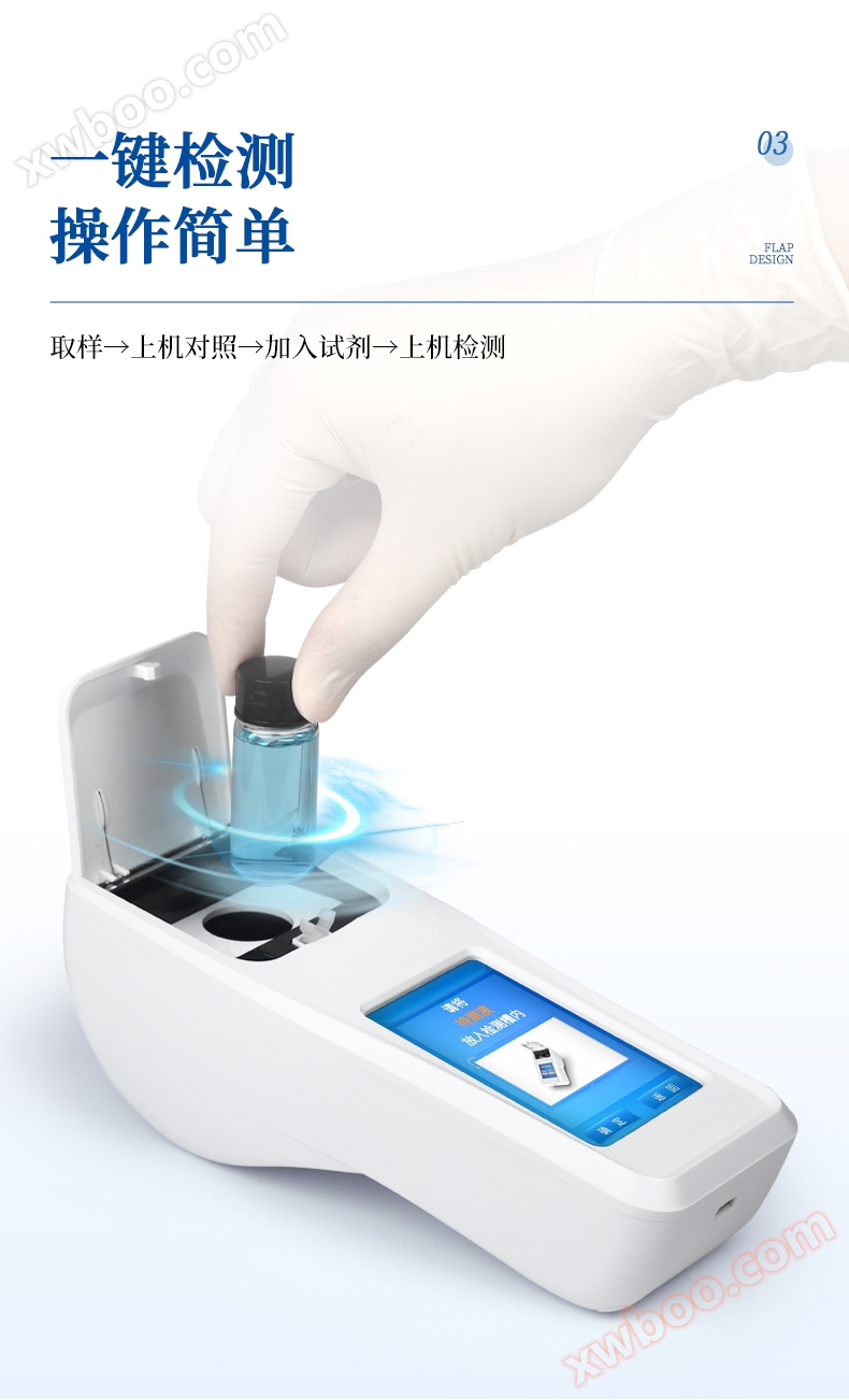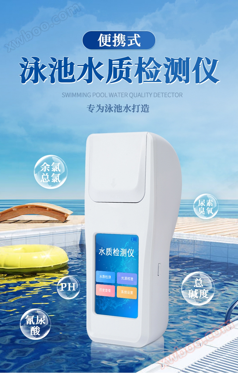 The swimming pool water quality detector can quickly detect residual chlorine, total chlorine pH、 Cyanuric acid, total alkalinity detection and other indicators are suitable for use in swimming venues, indoor and outdoor swimming pools, water parks, hot spring baths, and other fields. Combined with rapid colorimetric detection reagents, it can measure quickly, simply, accurately, and stably. It has a beautiful appearance, simple operation interface, and accurate detection system, helping users obtain fine data and analyze water conditions more accurately and effectively.