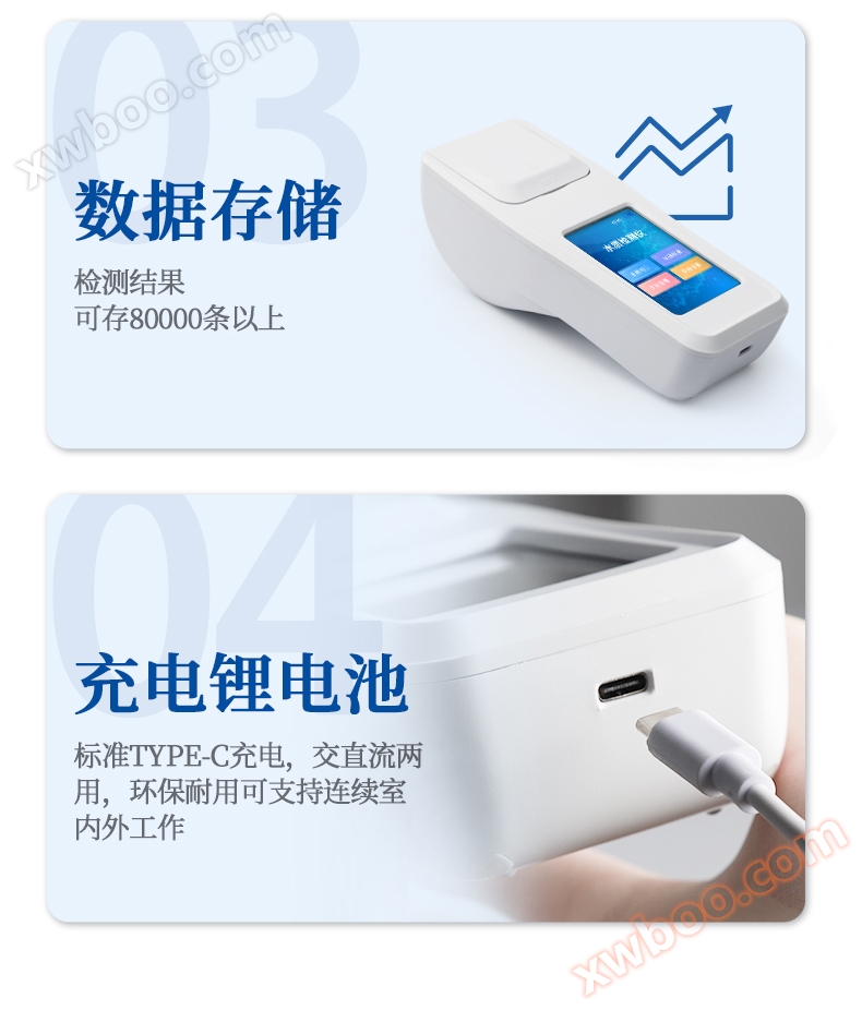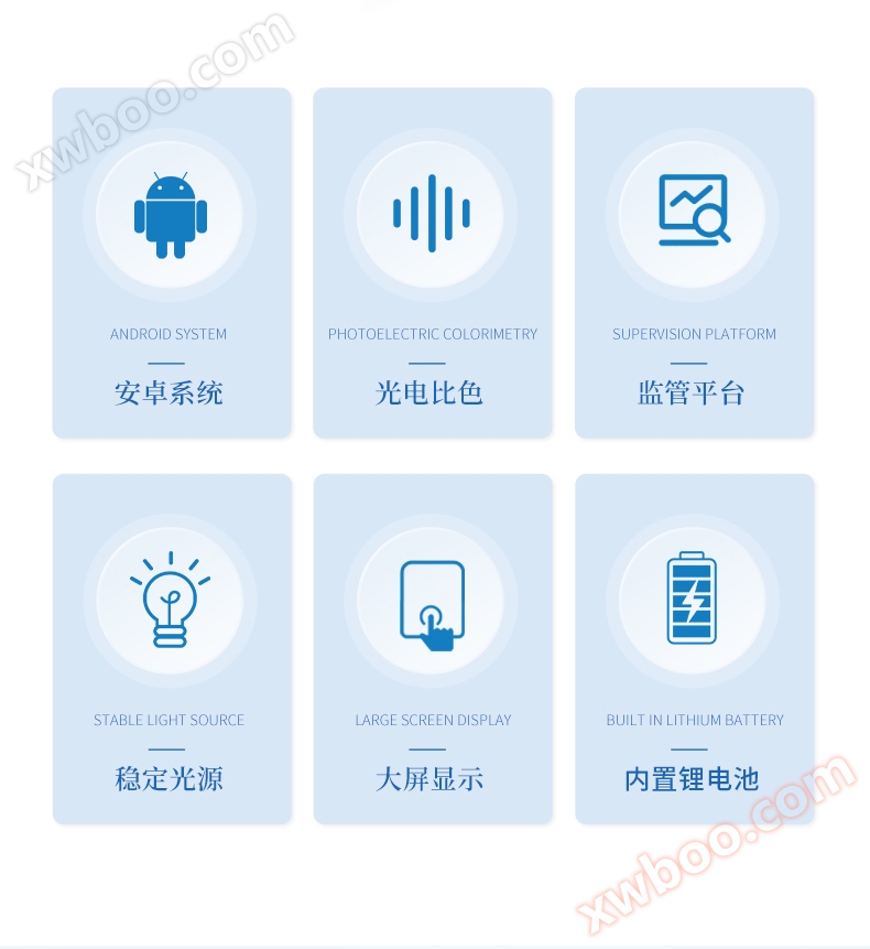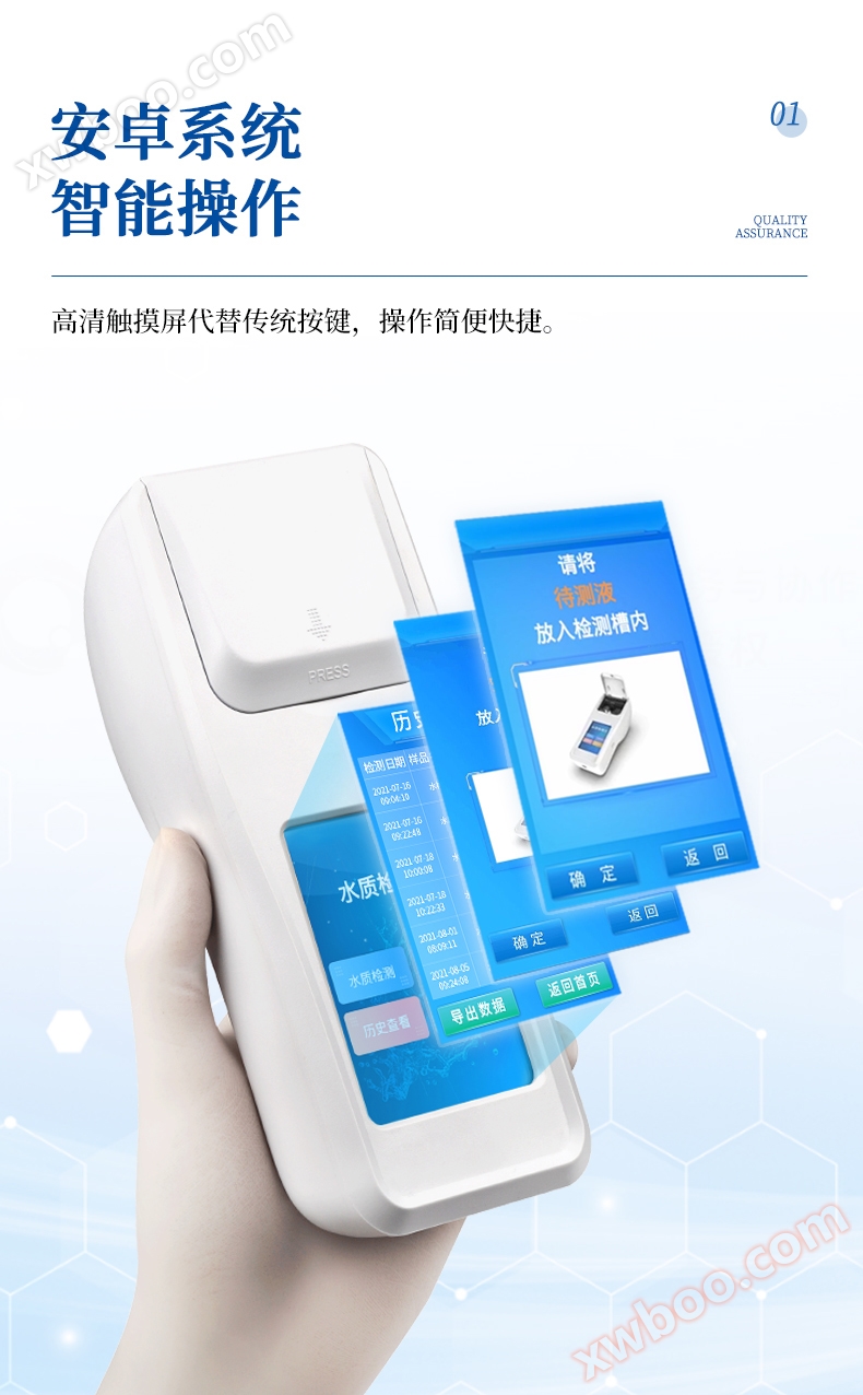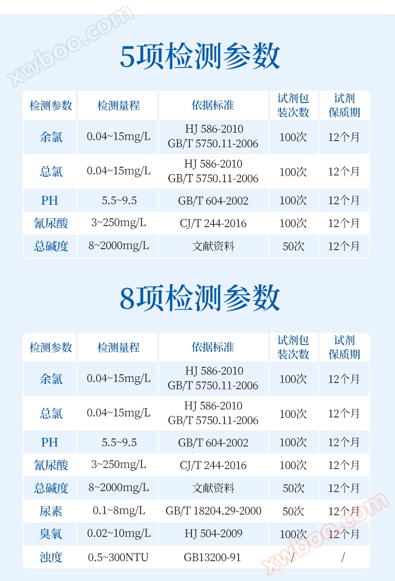 The swimming pool water quality detector can quickly detect residual chlorine, total chlorine pH、 Cyanuric acid, total alkalinity detection and other indicators are suitable for use in swimming venues, indoor and outdoor swimming pools, water parks, hot spring baths, and other fields. Combined with rapid colorimetric detection reagents, it can measure quickly, simply, accurately, and stably. It has a beautiful appearance, simple operation interface, and accurate detection system, helping users obtain fine data and analyze water conditions more accurately and effectively.