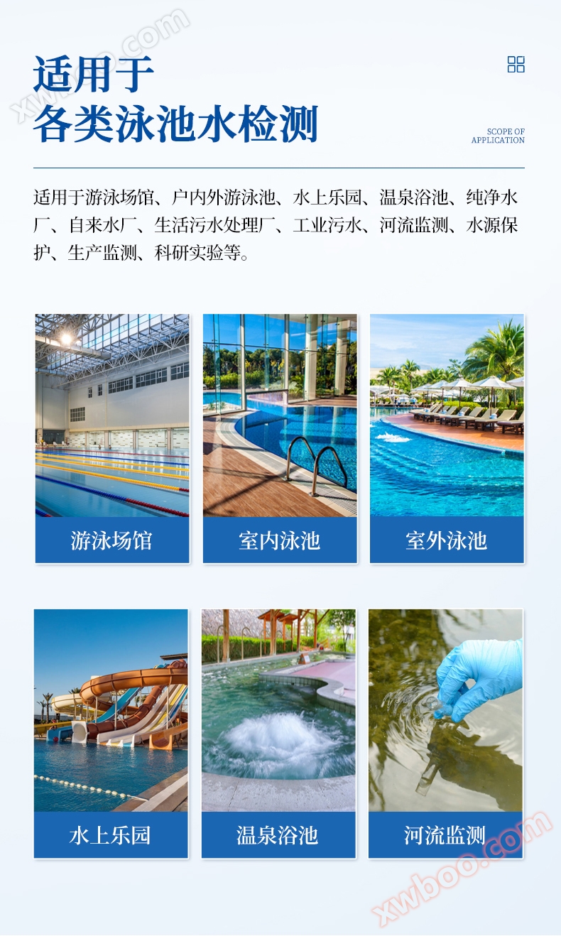 Suitable for swimming venues, indoor and outdoor swimming pools, water parks, hot spring baths, purified water plants, waterworks, domestic sewage treatment plants, industrial wastewater, river monitoring, water source protection, production monitoring, scientific research experiments, etc.
