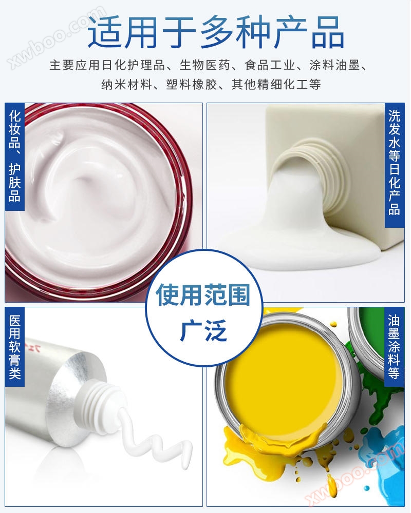 3. Food industry: various types of pastry sauces such as mayonnaise, salad dressing, chocolate sauce, and catnip, seasoning sauces, pastry and bread fillings, sesame paste, custard sauce, food additives, beverages, jams, butter, animal fats, health food, baby food, pet food, etc., can be customized according to the production or research and development requirements of the food industry.