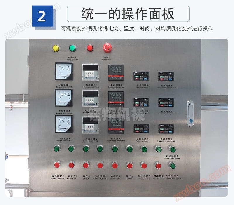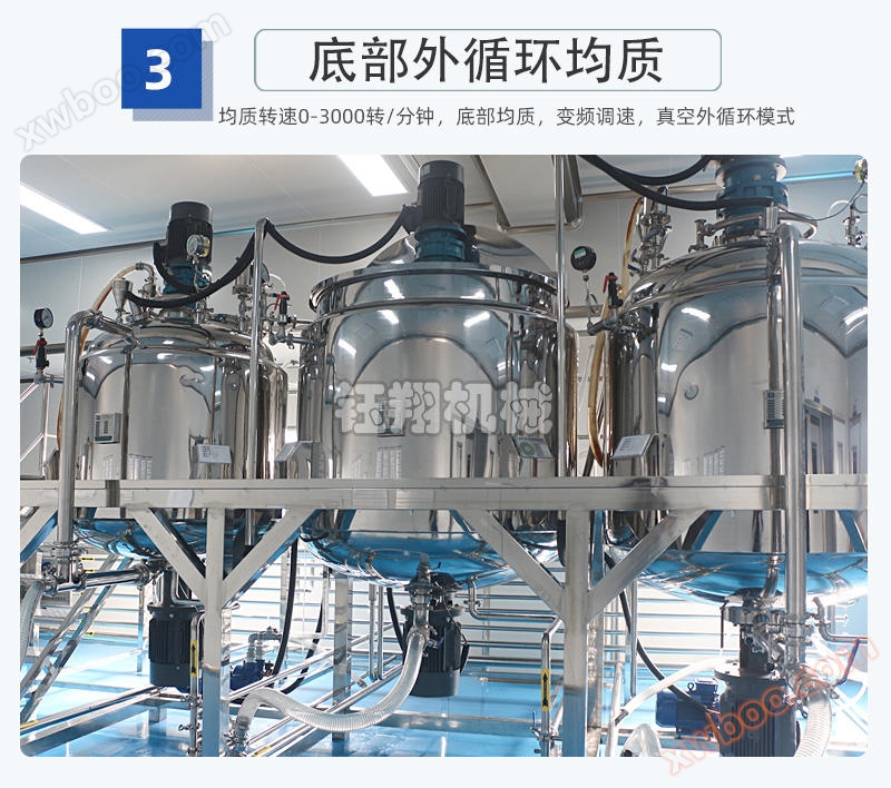 Our company produces a variety of vacuum homogenizers and emulsifiers, including upper homogenization, lower homogenization, internal and external circulation homogenization for the homogenization system, and unidirectional and bidirectional stirring for the stirring system, as well as screw belt stirring; The lifting system is divided into single cylinder and double cylinder lifting, and various products that meet customer requirements can be customized;