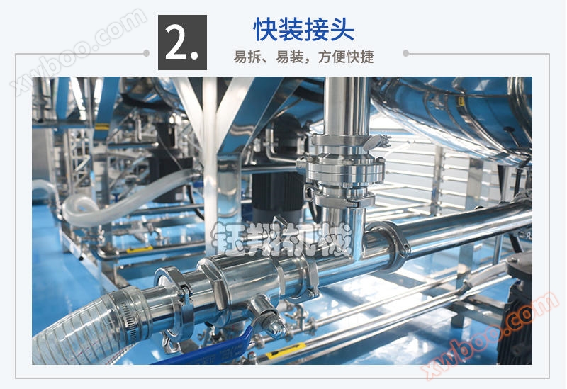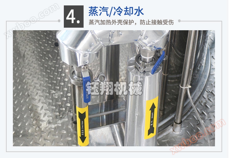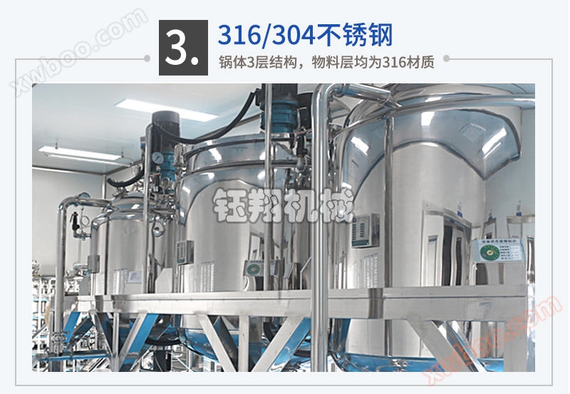 The pot body is composed of three layers of imported stainless steel plates welded together, and the tank body and pipes are mirror polished, meeting GMP requirements; According to the process requirements, the tank can heat and cool materials, and the heating methods mainly include steam and electric heating;